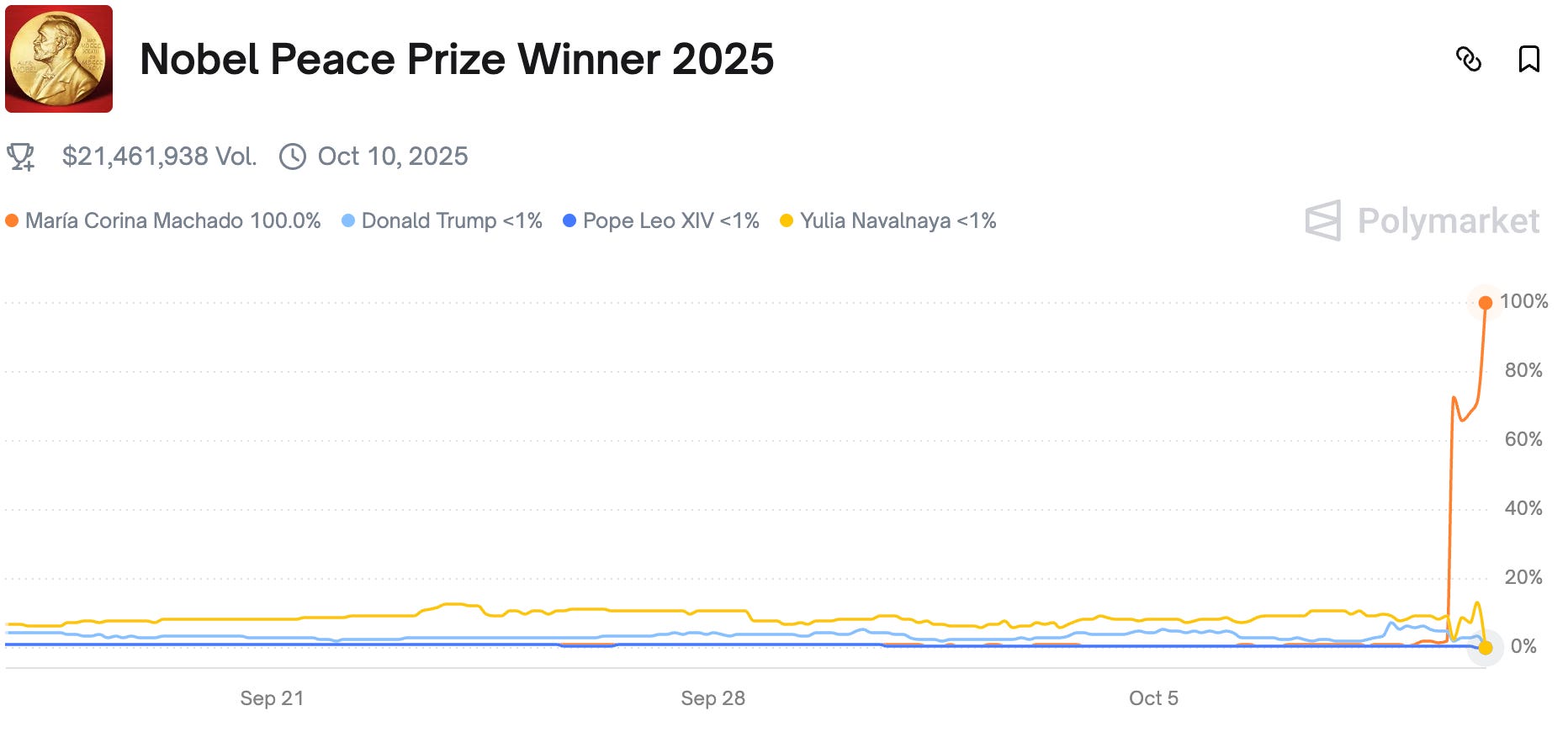 Last week, a few hours before the official Nobel Peace Prize announcement, a trader on Polymarket started buying shares of María Machado to win. The price spiked, fast.