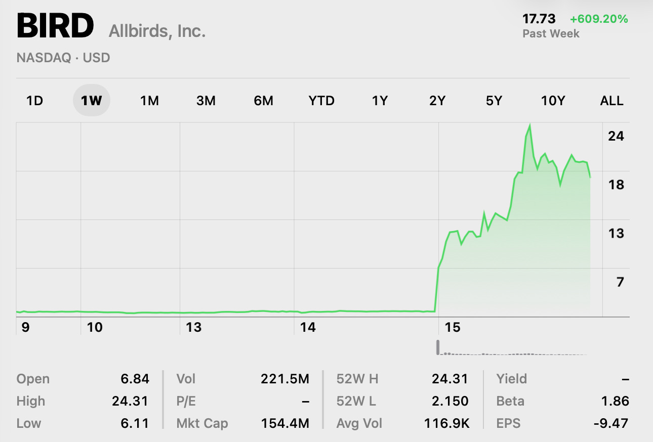 This morning, Allbirds announced they are pivoting from making shoes to selling AI compute. The stock is up more than 500% in a couple of hours.