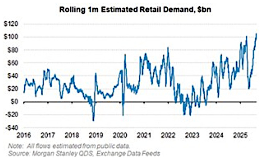 Retail investors just bought over $100 billion of US stocks in a single month—the largest on record. We’ve never seen anything close. Not in the meme-stock era, not during the pandemic stimulus checks, not even when GameStop briefly became everyone’s retirement plan.