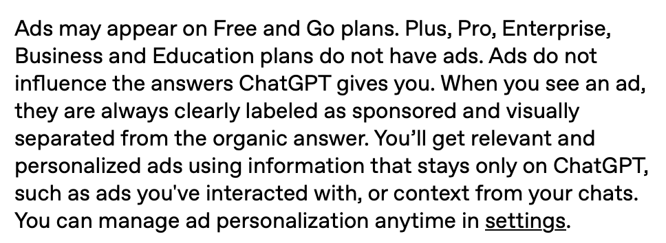 “Ads may appear on Free and Go plans... Ads do not influence the answers ChatGPT gives you. When you see an ad, they are always clearly labeled as sponsored and visually separated from the organic answer.”